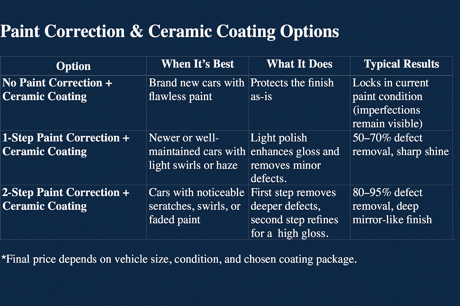 We start with a thorough exterior wash, followed by a clay bar treatment to remove embedded contaminants that regular washing can't eliminate. Then, we polish the paint to correct swirl marks and light scratches, restoring a smooth, high-gloss finish. Finally, we apply a premium ceramic coating that adds long-lasting protection, enhances shine, and makes future cleaning easier. This service provides superior paint correction and lasting surface protection.